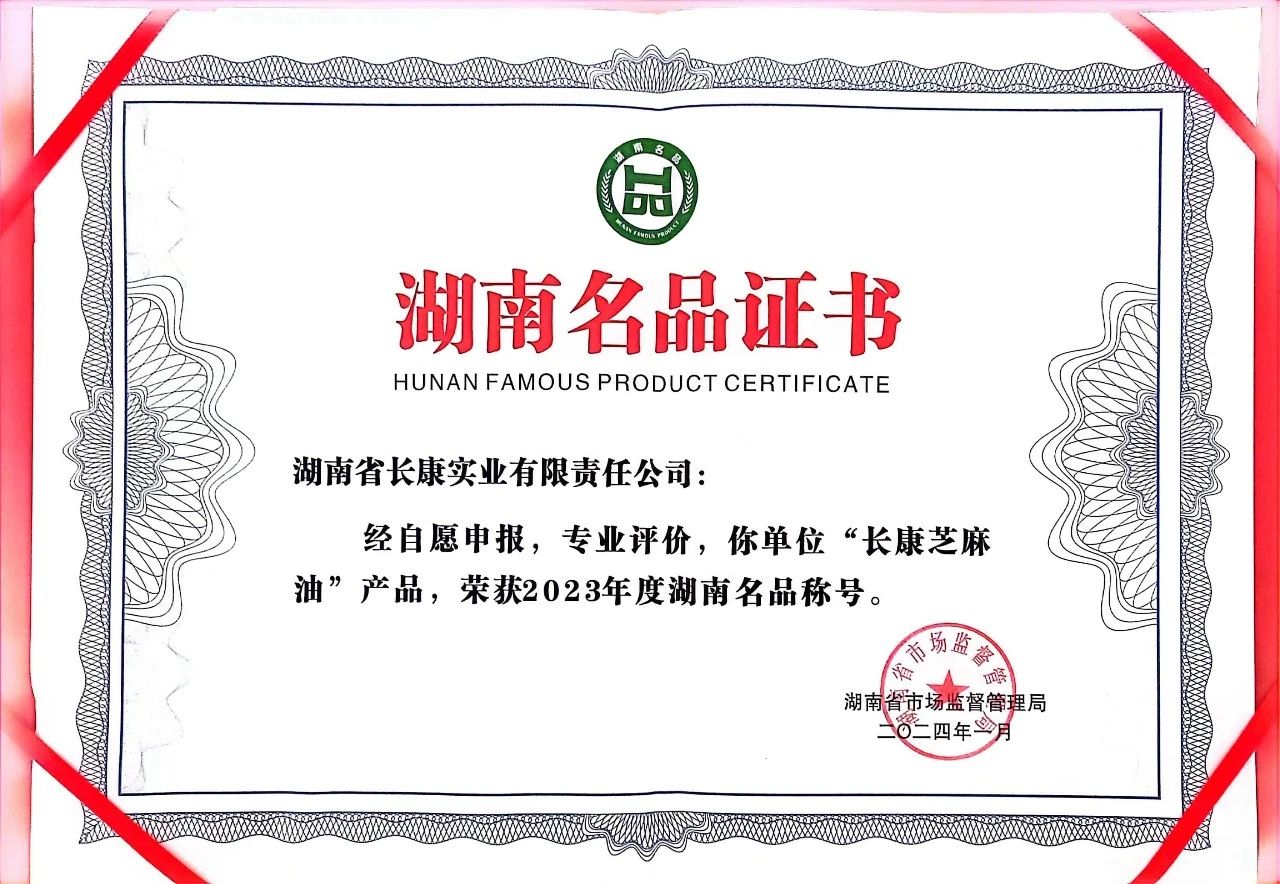 其中,長康芝麻油憑借卓越的產(chǎn)品品質(zhì)和良好的市場口碑,榮獲2023年度湖南名品稱號。